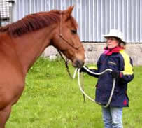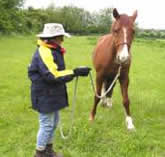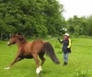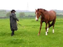 Well, various alarms and excursions, accidents, joys and triumphs down the road, I made my first attempt to “do natural horsemanship” with Highland. With book in one hand and horse in the other this was short and not very sweet. Next time round, I quickly started looking for help and found Kate through this site. Things went considerably better…